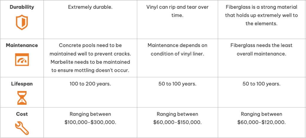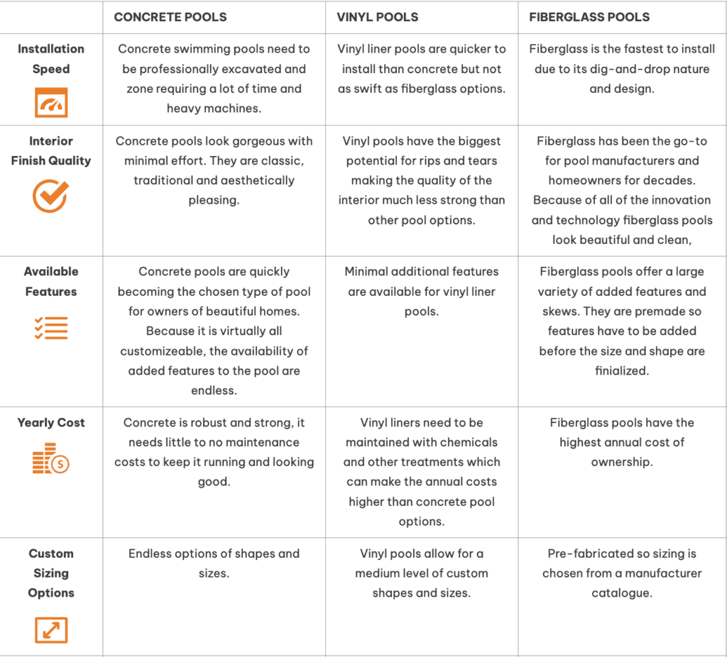 • Pool Type: The cost varies significantly between vinyl, fiberglass, concrete, and ICF pools, each detailed in the provided chart.